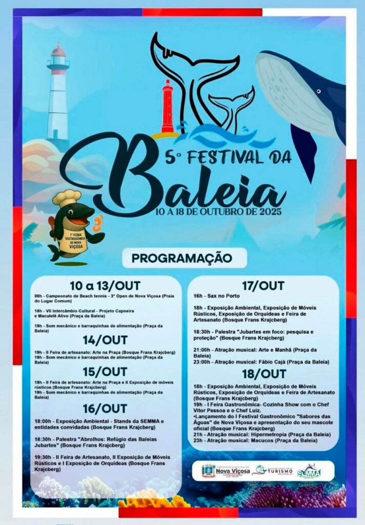 O 5º Festival da Baleia de Nova Viçosa é uma iniciativa da Prefeitura Municipal de Nova Viçosa, através da Secretaria de Meio Ambiente e Turismo (SEMMA), reforçando o compromisso com a sustentabilidade e o desenvolvimento turístico da região.