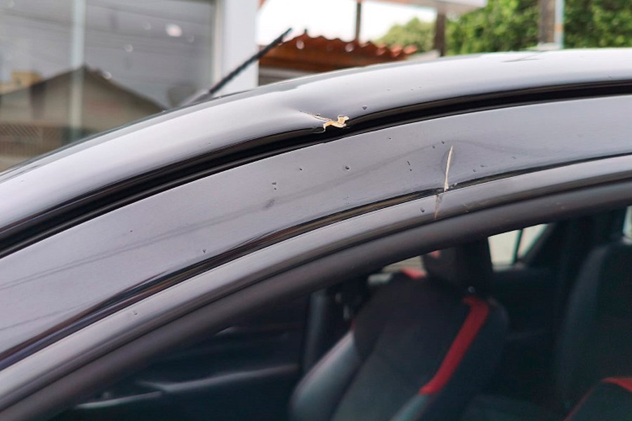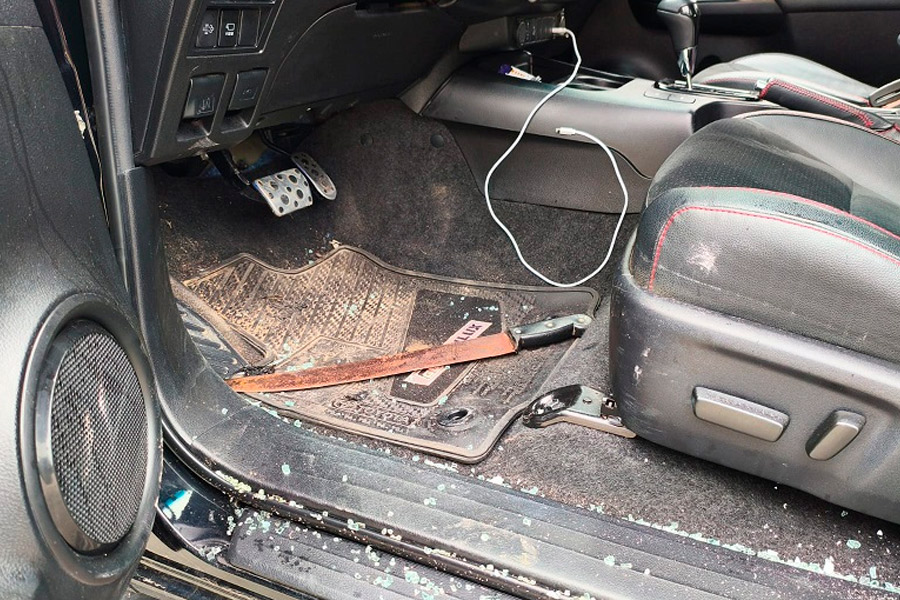 * As marcas do ataque no veículo, incluindo o vidro quebrado.