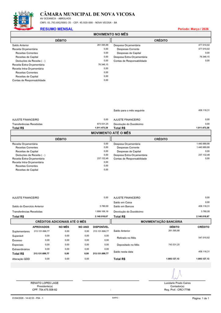 Câmara Municipal de Nova Viçosa publica Resumo Financeiro referente a março 2026