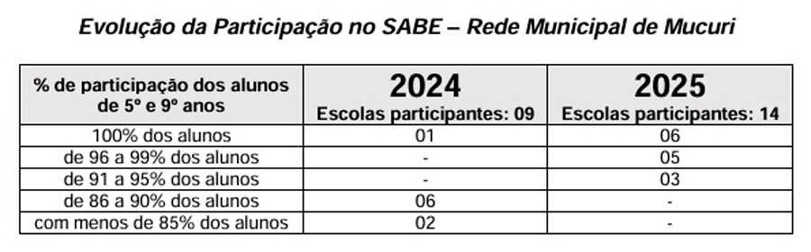 Para a Consultora Pedagógica da Secretaria Municipal de Educação, professora Clarissa Magalhães, os resultados do SABE 2025 serão motivo de grande orgulho para toda a rede: “Temos certeza de que as escolas estão preparadas e determinadas a entregar o seu melhor. Esse é o reflexo de um trabalho coletivo, de um compromisso que une gestores, professores, alunos e famílias em torno de um mesmo propósito: a aprendizagem das crianças e dos adolescentes de Mucuri”. Clarissa também destacou a parceria das famílias, que compreenderam seu papel fundamental nesse processo: “Pelo número de alunos presentes nas provas, neste ano, vemos o quanto os pais e responsáveis abraçaram essa causa, enviando seus filhos para a escola com entusiasmo e responsabilidade”.