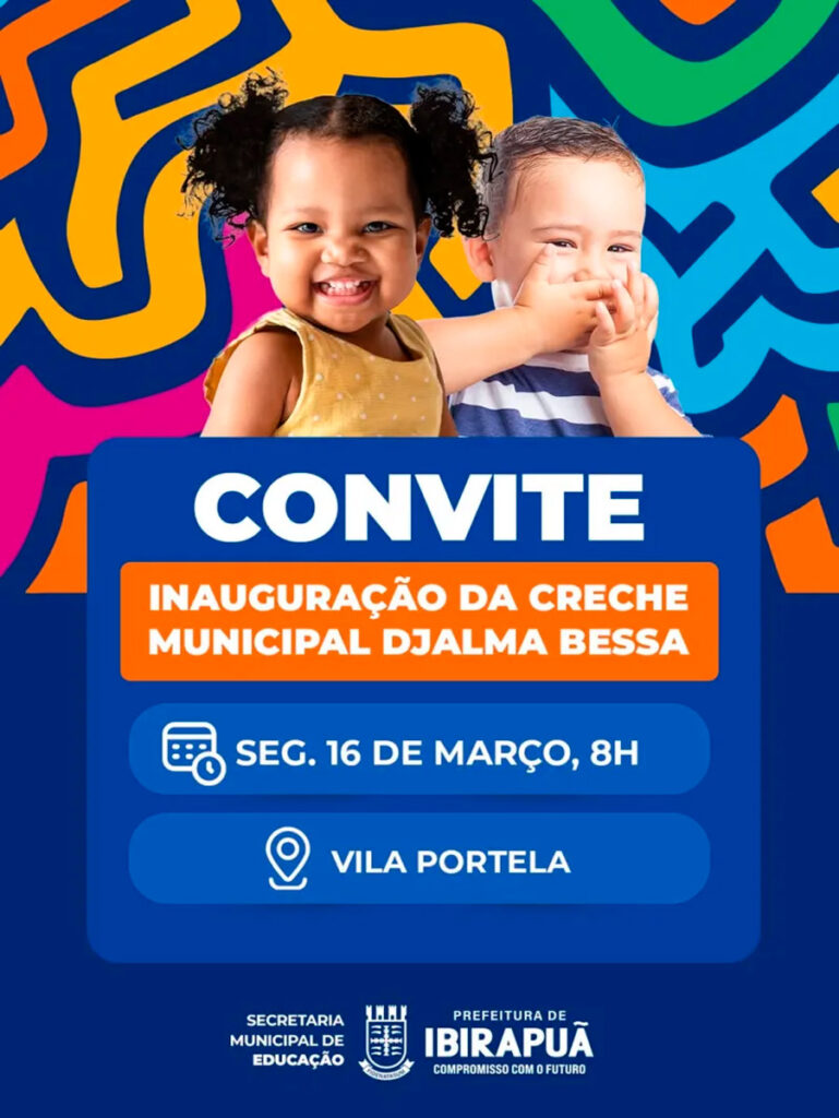 A Prefeitura de Ibirapuã realiza, na próxima segunda-feira (16), às 8h, a inauguração da Creche Municipal Djalma Bessa, localizada em Vila Portela, distrito do município. A nova unidade representa um importante avanço para a educação infantil da localidade, ampliando o acesso das crianças a um espaço adequado para aprendizado e cuidados.