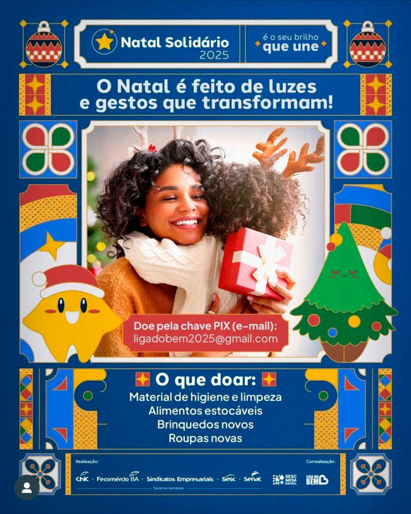 A campanha Natal Solidário envolve toda a sociedade em uma grande rede de solidariedade. As doações podem ser feitas em produtos ou em dinheiro, por meio de chave PIX, em nome do Instituto Liga do Bem. Um dos fundadores desta entidade é Loyola Neto, o mesmo que está no centro das denúncias anteriores. Ele, atualmente, é Conselheiro Fiscal da Liga do Bem. No site e nas redes sociais da Fecomércio, tanto o QRcode, quanto a chave pix: ligadobem2025@gmail.com disponibilizados pertencem ao Instituto.