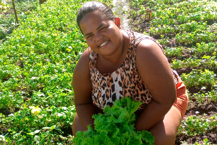 “Aqui eu produzo de tudo um pouco, desde alface, coentro, salsa e cebolinha, até quiabo, feijão de corda, jiló, abóbora, pimentão e algumas frutas também. Com a horta, eu passei a oferecer alimento saudável para minha família e ainda vender o excedente”, afirma a agricultora Nathania do Vale Lima.