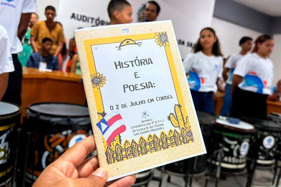 Uma manhã de autógrafos marcou um momento importante para a rede pública de ensino em Mucuri, no dia 24 de setembro, com a culminância do Projeto “História e Poesia: O 2 de Julho em Cordel”, com a presença do secretário municipal de Educação, professor Dalmo Costa. Alunos do 8º ano da Escola Municipal Deputado Federal Luís Eduardo Magalhães, com a orientação dos professores Janainna Alves, Ivan Dias e Andressa Bartasson, desenvolveram o projeto que trabalhou história e literatura, unindo as disciplinas para contar por meio da criação de poemas de cordel, a luta pela Independência da Bahia, ocorrida em 2 de julho de 1823.