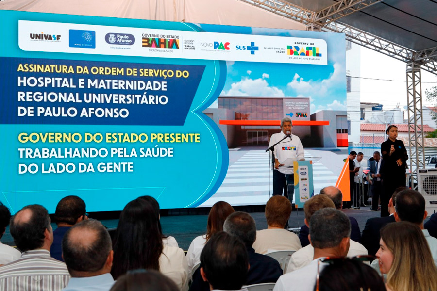 O governador Jerônimo Rodrigues, acompanhado da Secretária da Saúde do Estado, Roberta Santana, assinou, nesta sexta-feira (7), a ordem de serviço para a construção do novo Hospital e Maternidade Regional Universitário de Paulo Afonso. A obra, que será executada pela Companhia de Desenvolvimento Urbano do Estado da Bahia (Conder) e tem área de construção prevista de 15,2 mil metros quadrados, conta com investimento de R$ 148,9 milhões, por meio de recursos do Programa de Aceleração do Crescimento (Novo PAC), do Governo Federal, do Governo do Estado e também da Eletrobrás.
