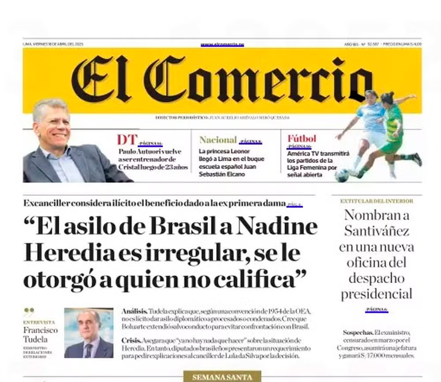 Já o diário “El Comercio” desta sexta destaca o ex-chanceler Francisco Tudela, o qual afirma que a ex-primeira-dama não deveria ter o benefício concedido por Brasília: “O asilo do Brasil a Nadine Heredia é irregular, foi outorgado a quem não se qualifica”.