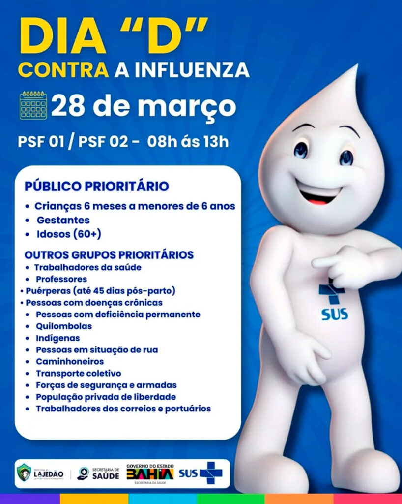 A Prefeitura de Lajedão, por meio da Secretaria Municipal de Saúde e em parceria com o Governo do Estado da Bahia, promove neste sábado (28) o Dia “D” de Vacinação contra a Influenza. A ação visa ampliar a cobertura vacinal e proteger os grupos mais vulneráveis da população, com atendimento das 08h às 13h nas unidades PSF 01 e PSF 02.