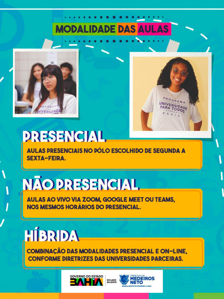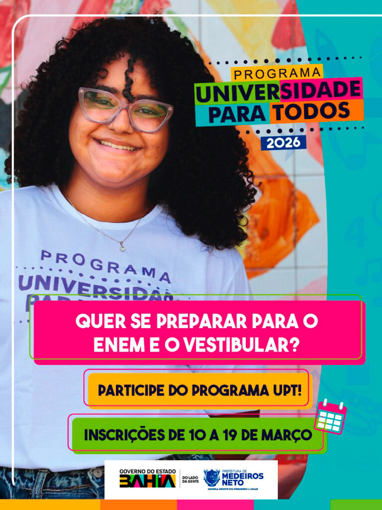 Estão abertas, de 10 a 19 de março, as inscrições para o programa Universidade para Todos (UPT) em Medeiros Neto. O programa, uma iniciativa do Governo do Estado executada pela Universidade Federal do Sul da Bahia (UFSB), conta com o apoio estratégico da Prefeitura Municipal, via Secretaria de Educação, e do CETEP Medeiros Neto.