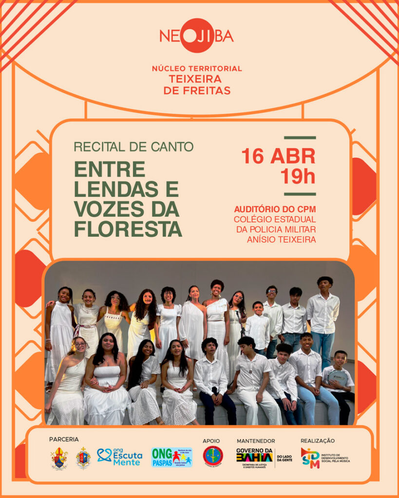 O Núcleo Territorial do NEOJIBA de Teixeira de Freitas convida a comunidade para prestigiar o Recital do Coro Infantil, que será realizado no dia 16 de abril de 2026, às 19h, no Colégio da Polícia Militar Anísio Teixeira (CPM). A apresentação tem como tema “Entre lendas e vozes da floresta” e é gratuita e aberta ao público.