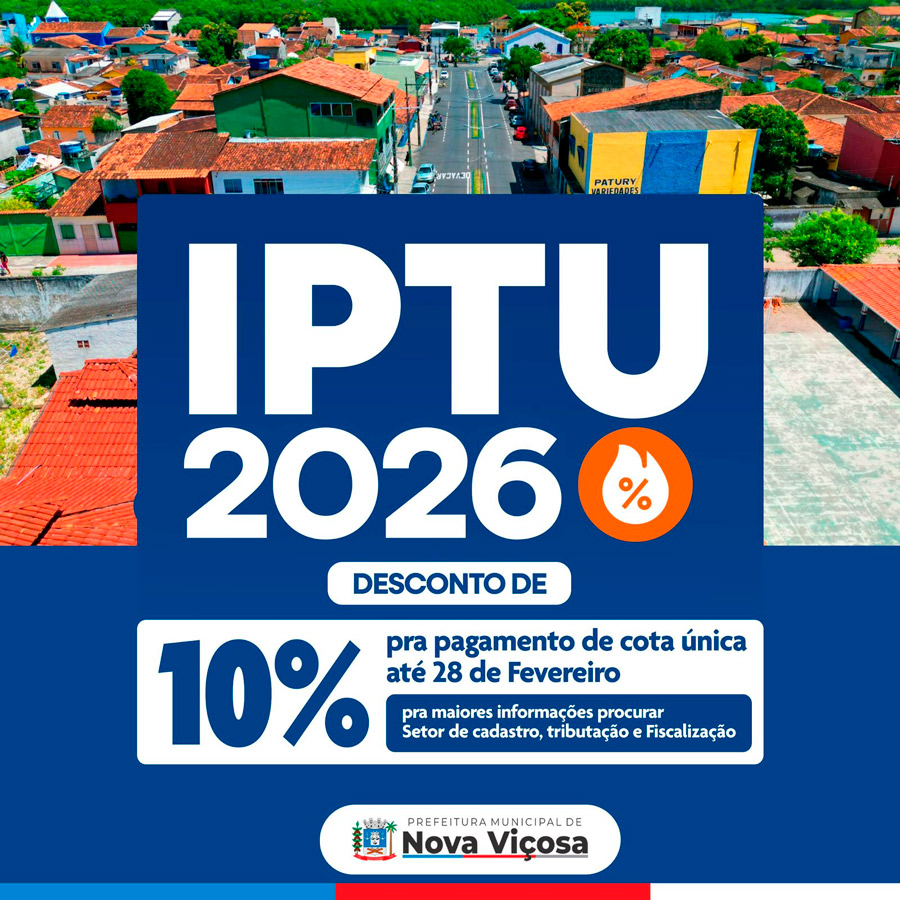 A Prefeitura de Nova Viçosa reforça o alerta aos contribuintes para que fiquem atentos ao calendário tributário municipal referente ao IPTU 2026. Quem optar pelo pagamento em cota única até o dia 28 de fevereiro garante 10% de desconto, uma excelente oportunidade para economizar e manter os tributos em dia.