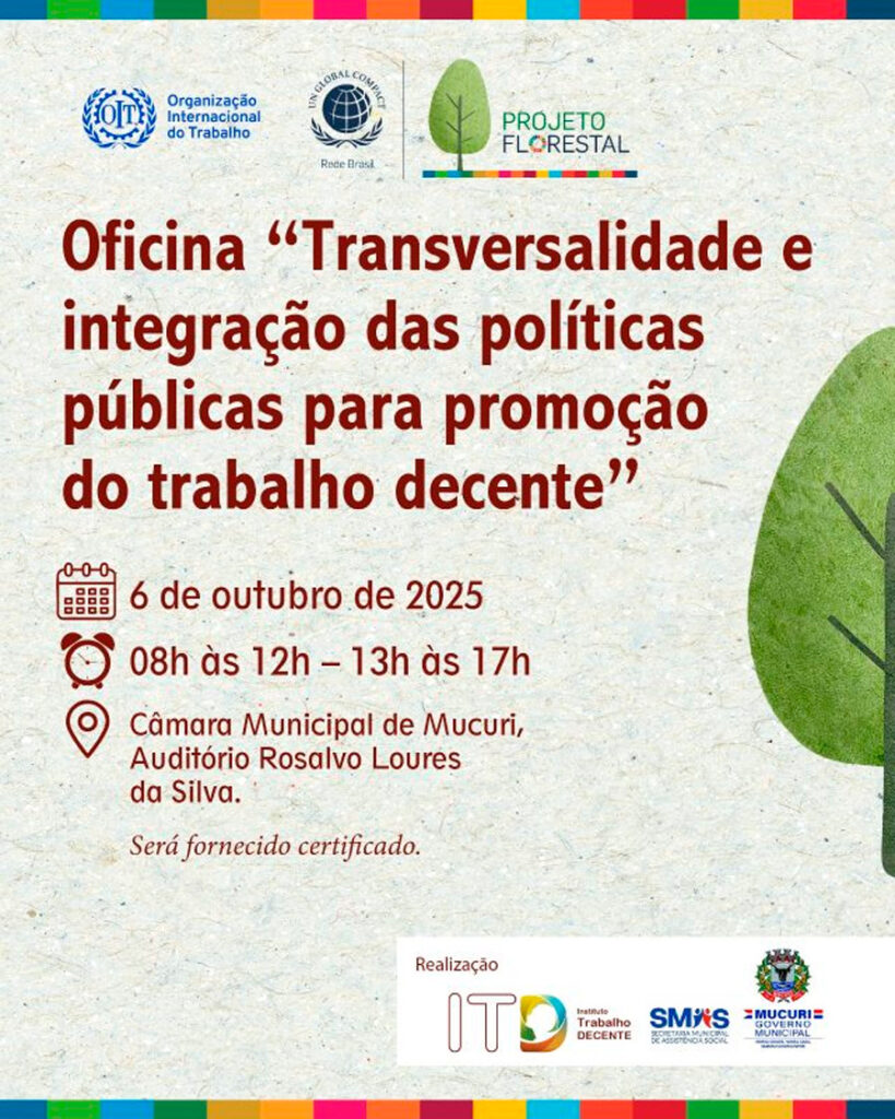 Na próxima segunda-feira, 06 de outubro, Mucuri sediará a oficina “Transversalidade e integração das políticas públicas para promoção do trabalho decente”, uma iniciativa realizada pelo Instituto Trabalho Decente em parceria com a Secretaria Municipal de Assistência Social. O evento acontecerá na Câmara Municipal das 08h às 17h, voltado para a formação de participantes da gestão, diretoria e coordenação, assim como técnicos e representantes da sociedade para debater estratégias que fortaleçam as políticas públicas no município.
