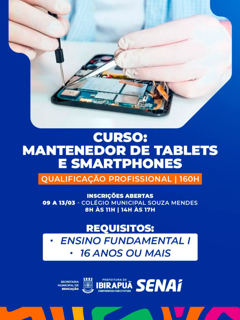 A Prefeitura de Ibirapuã abriu inscrições para o curso de Mantenedor de Tablets e Smartphones, uma iniciativa de qualificação profissional realizada por meio da Secretaria Municipal de Educação em parceria com o SENAI. A formação terá carga horária de 160 horas e visa ampliar as oportunidades de capacitação e geração de renda para a população.