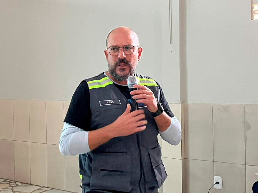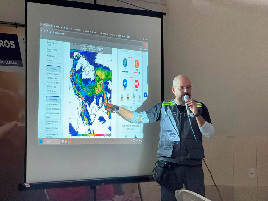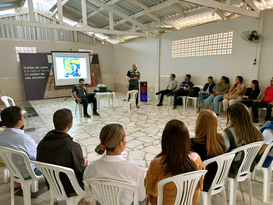 Durante o encontro, foram apresentadas análises técnicas relacionadas ao monitoramento de desastres, abordando a prevenção de doenças associadas às enchentes e a importância da vacinação para a população afetada.
