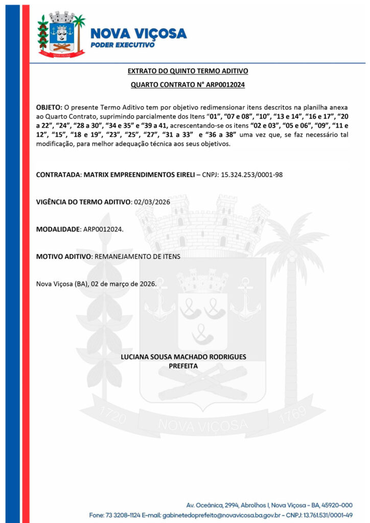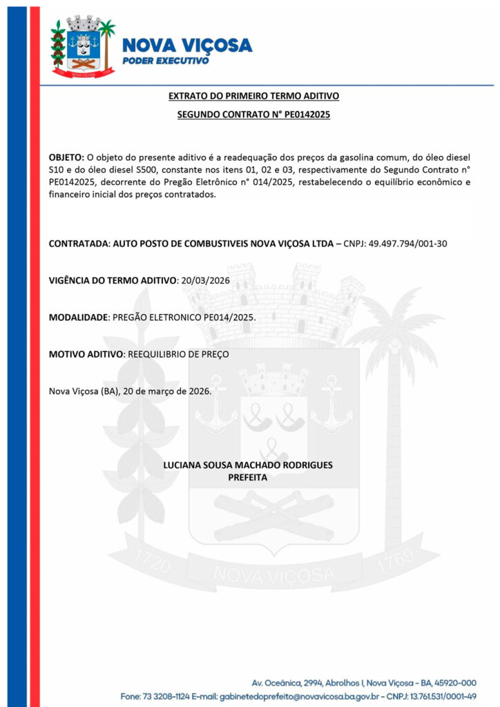 Prefeitura de Nova Viçosa divulga extrato do primeiro termo aditivo, segundo contrato nº PE0142025