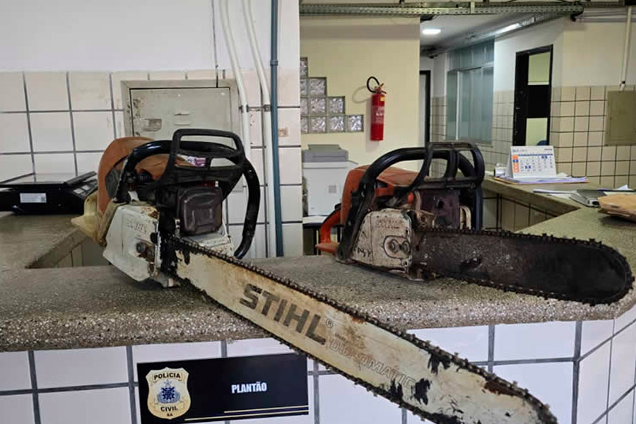 Durante a ação, a Polícia Militar apreendeu dois motosserras, um caminhão azul, marca Mercedes-Benz, placa KHN-5G04, e um caminhão Volkswagen, de cor branca, placa JQJ-9C90.
