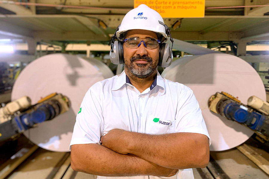 O supervisor de acabamento de papel, Vádison Motta, trabalha na indústria papeleira há mais de 24 anos, sendo 21 anos na Suzano, e se orgulha do ofício e da trajetória. “Entrei na área industrial aos 21 anos, carregando apenas a vontade de aprender. Com o tempo fui subindo de cargo. Aprendi sobre nosso processo de produção e, mais tarde, como liderar uma equipe com respeito e humildade. Hoje sou supervisor da linha de acabamento. Trabalhar na indústria papeleira é mais do que um ofício, é carregar uma responsabilidade que começa na floresta e termina nos cadernos das crianças, nas embalagens que protegem alimentos, nos livros que contam histórias. Cada fibra que moldamos é parte do que sustenta essa região economicamente e socialmente”, ressalta Vádison.